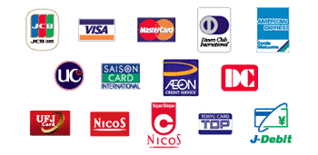 JCB ・ VISA ・ MASTER ・ ダイナース ・ アメリカンエキスプレス・UC・セゾン・イオン・DC・NICOSなど、左記のクレジットカード。 | |